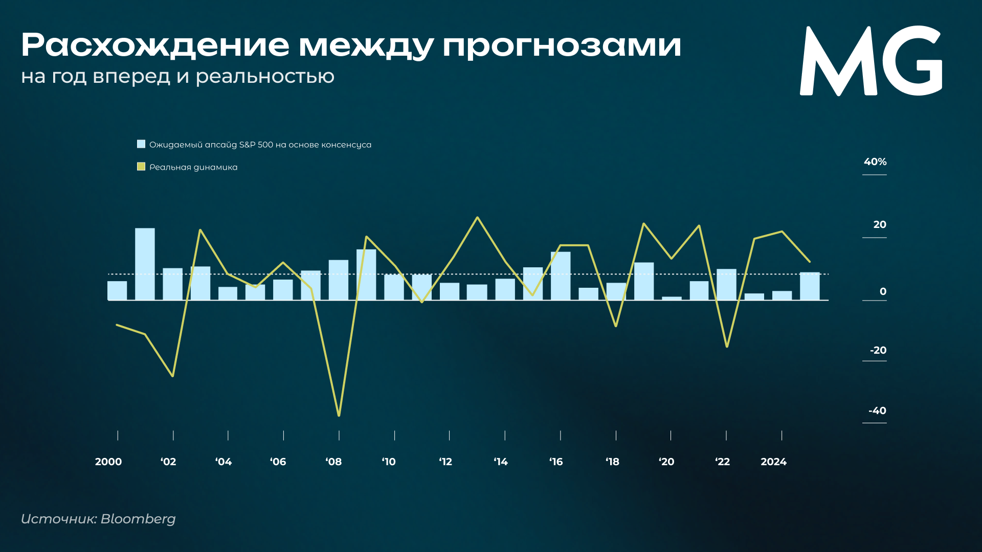 Прогнозы аналитиков на год вперед известны своей систематической неточностью. Действительно, за последние 20 лет корреляция между прогнозируемой доходностью и фактической доходностью в следующем году для прогнозов, составленных по методу «снизу вверх», составила 0,2, а для прогнозов стратегов, которые смотрят на рынок «сверху вниз» — 0,0.