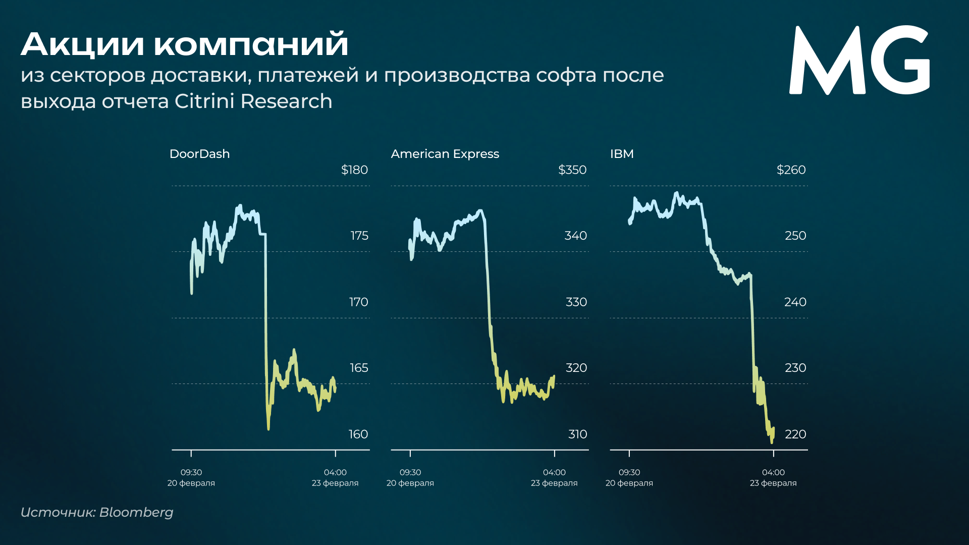 Вызвавший широкий резонанс отчет Citrini Research представил гипотетический сценарий 2028 года, в котором ИИ-агенты радикально перестраивают экономику: массовая безработица среди офисных работников, снижение потребления и напряжение в финансовом секторе. В частности, описывается, как ИИ может вытеснить традиционные сервисы доставки и обойти платежные сети вроде Visa и Mastercard, устраняя комиссии и подрывая их бизнес-модель. Публикация спровоцировала резкую распродажу акций компаний из сфер софта, финтеха и доставки, включая IBM, DoorDash и American Express. При этом авторы подчеркивали, что речь идет о сценарии, а не о прогнозе, однако рынок отреагировал так, как если бы описанные риски уже стали базовым вариантом развития событий.