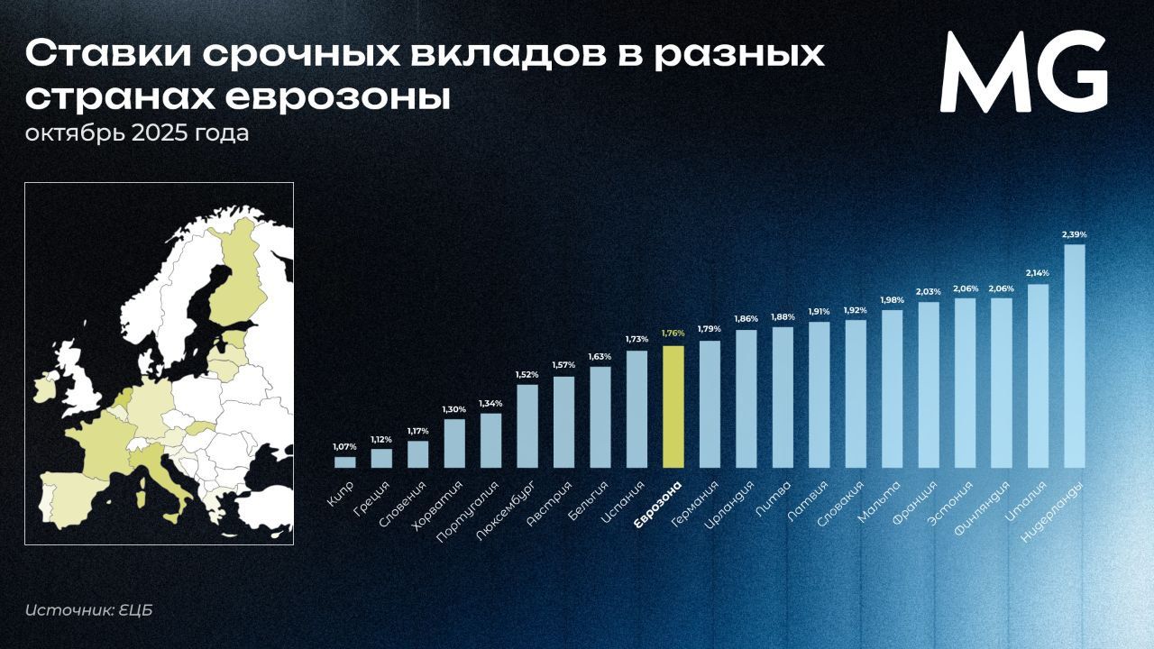 Так, при ставке 1,76% в среднем по еврозоне вкладчики на Кипре открывают новые срочные вклады лишь под 1,07% годовых, а в Нидерландах — под 2,39%. В топ-3 по доходности также попадают Италия и Финляндия (до 2,1%), а среди аутсайдеров — балканские страны и Португалия (до 1,3%).