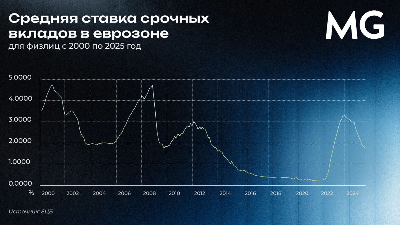 За последние 25 лет доходность вновь заключаемых срочных вкладов (на конкретный срок) в евро для населения менялась в диапазоне от 0% до 5% годовых. За эти годы рынок депозитов пережил несколько этапов, и в 2025 году он заметно отличается от рынка 2000-х и 2010-х годов.