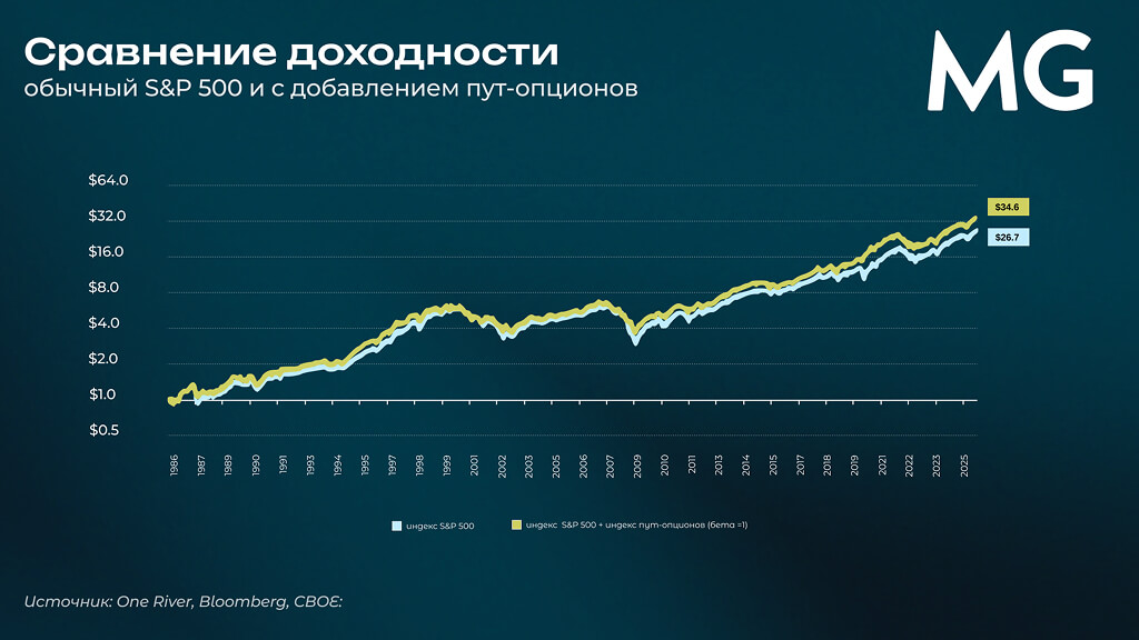 Регулярная покупка пут-опционов, например, на индекс S&P 500 со страйком на 5% ниже текущей цены актива («вне денег») очевидным образом имеет отрицательную доходность на длинном горизонте. Но дает премию за выпуклость (крупную разовую прибыль) на экстремальных просадках рынка.