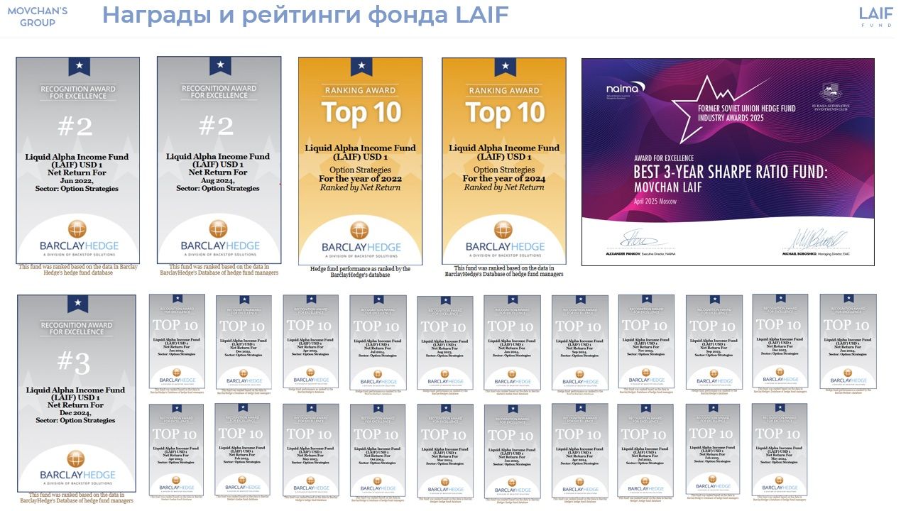 Oct 15, 2025В этом месяце один из самых востребованных среди клиентов Movchan's Group инвестпродуктов — стратегия LAIF (Liquid Alpha Income Fund) — отмечает 5-летний юбилей. Это 5 лет стабильного дохода без единой убыточной недели, что является большой редкостью для любого инвестиционного продукта. И это подтверждается уже довольно солидным списком наград, которые собрал фонд LAIF за эти 5 лет.