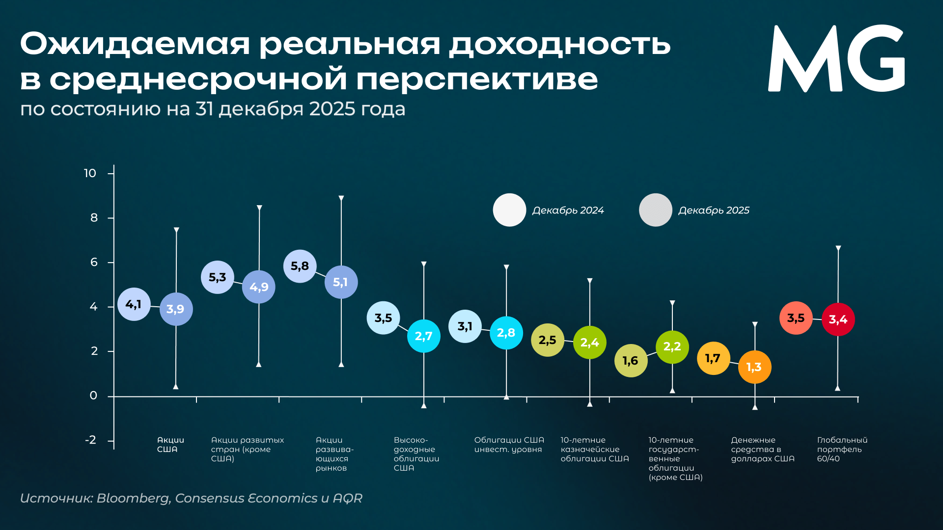 В начале года аналитики крупной международной управляющей компании AQR опубликовали традиционное ежегодное исследование, посвященное ожидаемой доходности основных классов активов на горизонте ближайших 10 лет. Подобные обзоры представляют особую ценность для инвесторов, поскольку позволяют формировать реалистичные ожидания, опираясь не на рыночные настроения, а на текущие оценки, уровень риска и фундаментальные параметры рынков.