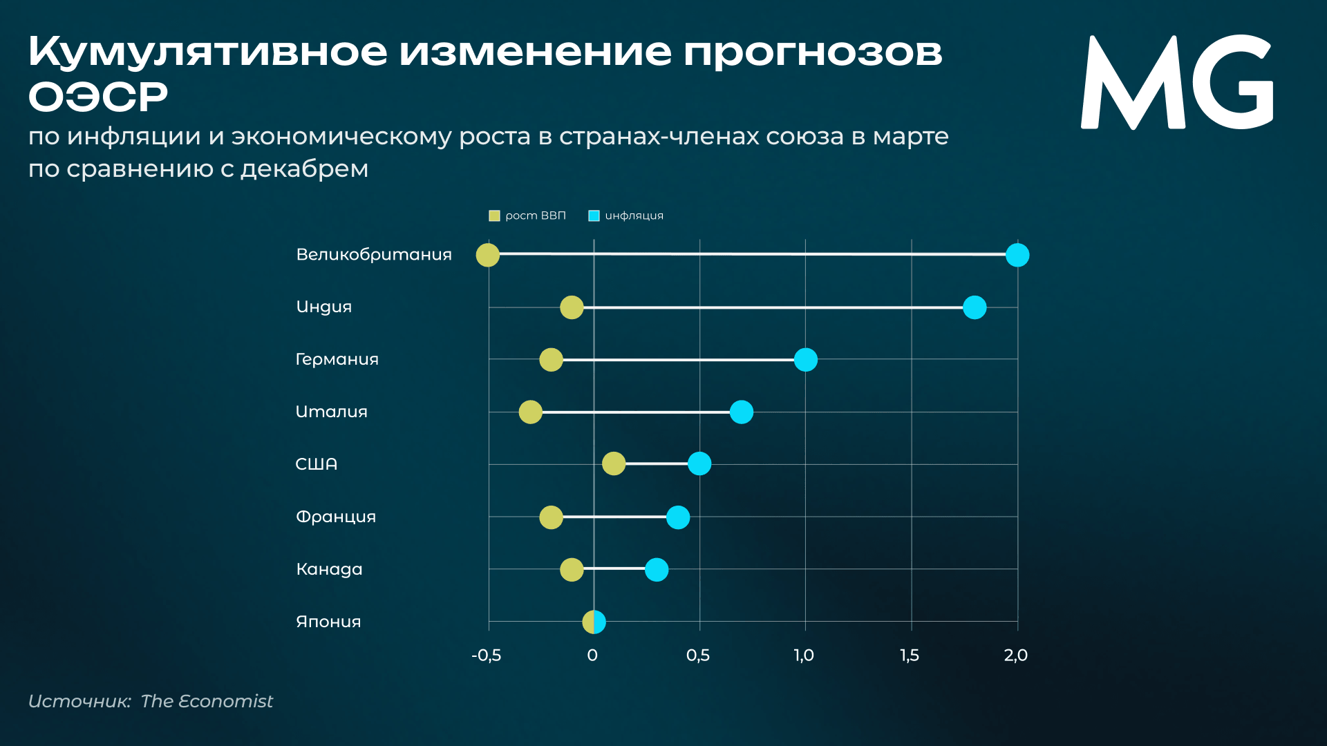 В апреле рынки стали полностью закладывать два повышения по 0,25 п.п. и примерно 70% вероятность третьего. Эти ожидания подняли доходности двухлетних облигаций почти на 1 п.п. — больше, чем в Европе и США. До перемирия Goldman Sachs ожидал, что Банк Англии может повысить ставки в апреле.